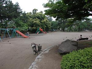 [9]馬場跡 現在は小さな遊園地になっている、市立博物館とプールの間の縦長の空間。この中をさらに土塁で仕切って細長い馬場にしていたらしい。実戦的な調教ができそうな感じではないですね。いわゆるお座敷馬術的な馬場なんでしょう。 |