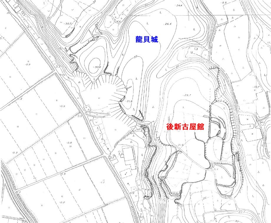 | 概説 | 登城館跡の谷を挟んだ南西,龍貝館跡の南方1kmに立地する。また、天神西遺跡の北西にあたる。大洗町で最も中世遺構が密集する水系の一角に立地する。「後新古屋」と隣接する「新古屋」という字名は北側にある「龍貝館」に対する「新」古屋と考えられる。 |