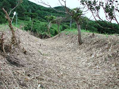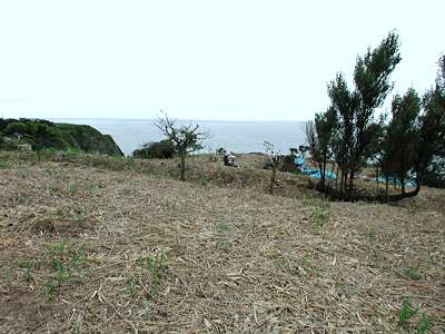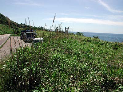 | 訪問記 | [2001/06/04]比石館から上ノ国へ戻る途中の国道228号線添いの小さな駐車場に説明板が立っていた。草が多くて空壕や土橋などの確認はできませんでした [2002/07/22]偶然通りかかったら草が刈られていたので覗いてみたところ、やはり発掘調査が行われていた。台地側とチャシとを区切る堀切もくっきり。中世よりも古い時代の物が出ているそうです。 |