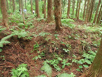 | 概説 | 箱館戦争時、この山中に新政府軍の伝習歩兵隊、遊撃隊、杜稜隊が布陣した。 矢不来台場(第1台場、第2台場)はすでに町文化財指定されているが、今まで考えられていた以上に縄張りは広大で、旧福山街道を中に取り込み、関所の役割を果たしていたらしい。重要な施設の付近を通るところでは街道を深く掘込み両側が見えないようにしていたと思われる場所もある。 第3の台場?:かつて矢不来天満宮のご神木の松ノ木(JR江差線工事で伐採された)があった辺り、国道228号線沿いのパーキング向いの張り出し部分が「新政府軍の攻撃を受けて土塁もひっくり返る程の被害を受けた」と記録に残る箱館戦争激戦地の矢不来台場ではないか。標柱と説明板のある山の上の矢不来台場は土塁がひっくり返るどころか、整然と残っていてそんな激戦が行われた場所とは思えない、と地元郷土史研究家のOさんは言う。 Oさんのお話では、文化財指定されていない北側の山中には星形土塁をはじめ散兵壕が点在していたが、開墾によって隠滅し地目境にわずかに残っているだけになっている、とのこと。 |