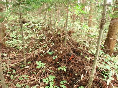 | 概説 | 上磯町の郷土史研究家Oさんのお話では、矢不来台場として文化財指定されていない北側の山中にも星形土塁をはじめ散兵壕が点在していたが、開墾によって隠滅し地目境にわずかに残っているだけになっている、とのこと。ここは北海道がリストアップした『道南地方の台場跡一覧』にある「矢不来台場2」のことらしい。 |