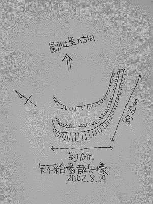 | 訪問記 | [2002/8/19]矢不来台場の約1km北西にある。台場を背後から守るかのような位置と方向を向いている。約20mX10mほどの範囲で幅1m弱の土塁が鈎の手に巡り、内部は掘り込まれている。こうした散兵壕はかつてはいくつもあってそのさらに背後の一段高いところに星形土塁があったそうだ。それらのほとんどは畑の開墾造成によって湮滅し、Oさんが知る限り残っているのはこれだけらしい。 |