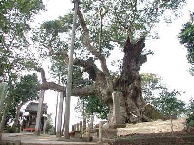 | 概説 | 宇賀神社境内に備え付けられていた山田町教育委員会のリーフレットには「この巨樹のある場所は、府馬城址の一角に当たる。府馬城は単郭方形で、面積は約20アールとあるがそれは本丸居館址で、実際はこのあたり一帯の地域が府馬城の址ではないかと思われる。」と書かれている。余湖さんによれば、宇賀神社周辺は府馬城の出城である山之下城で、府間城はその西側約300m付近にあるそうだ。 城を構えたのは千葉一族の府馬氏で、正中元年(1324---鎌倉執権北条高時・後醍醐天皇の頃)三代胤時の時といわれている。府馬氏はその後、永禄8年(1565---川中島の戦いの頃)に当主11代府馬左衛門時持が近隣の豪族との戦いで戦死したことにより、庶流に移った。 府馬の大クス:国指定天然記念物。官報でクスと明示されているが、 タブノキの誤りであることが明らかになっている。指定当時、俗にイヌグスと呼ぶことから種目を違え告示されたものと思われる。樹高20m、根回り約27.5m、幹囲12m、樹齢は1300〜1500年といわれる。[『府馬の大クス』リーフレット(山田町教育委員会)] |