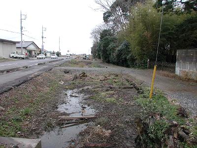 | 訪問記 | [2003/03/17]北側堀跡の東外れの民家の周囲には土塁が廻る。 [2003/03/31]今日は余湖さんとここで写真を撮していたら、地元のおばさんに何しているのかと尋ねられたので訳を話すと「そんな話は聞いたことがなかった」と云う。美浦村でも最近の調査報告に初めて載ったわけだし城館址で登録されているのでもないので一般には知られていないのだろう。ただ、おばさんの話では、写真の場所は田圃で、右側の屋敷の縁に昔から堀があったと教えてくれた。現在も水路が流れている。 |