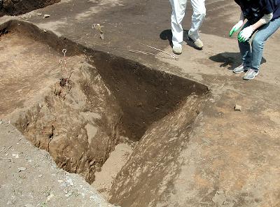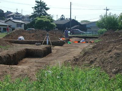 緊急の発掘調査風景(薬研堀を掘っているところ)![]() |