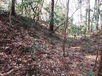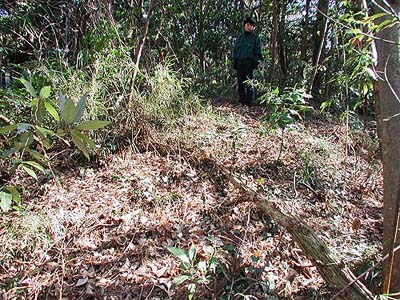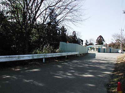 写真左手のガードレールの切れ目から山道を少し降りて行くと事業所の裏手に郭様の地形が見える。