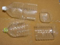 右写真のようにペットボトルを切断します。奥のボトルは、底から4〜5cmほどを切り取ります。底部分を蓋にします。手前のボトルは真ん中あたりの適当な位置で切断します。ボトル下部を飼育容器本体とします。![]() ペットボトルを切断するには、左写真のような専用のハサミがあると便利ですよ。 |