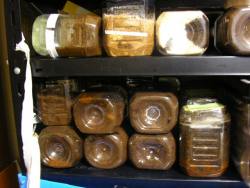 わが家のクワガタ棚です。縦や横に置かれたペットボトルが積み重なっています。中には幼虫、蛹、羽化したて新成虫が入ってます。 ちなみに左にぶらさがってるのは地震対策用ゴム帯。 |