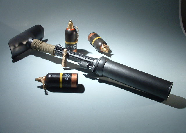 心より擲弾筒が好きな人間が集まって製作した、エアガン(?)です。50mm専用弾は他社製、装具は中田商店製です。通常、40mmモスカートを使用して射撃することができます。