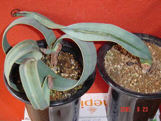 ●奇想天外はまず、根から発芽します。この根は1日数センチ伸びるが先端を傷つけたらおしまいで若苗は植え替えに耐えられません。なので発芽したと思ったら根が土に入り込まないうちに(このとき、柔らかいバーミキュライトが抜き易いのです)すぐに深めの鉢(径8センチ不可さ15センチくらいのプラ蘭鉢)に1本で植え替える。活着すれば1週間ほどで双葉があらわれ、ついで本葉が出ます。この葉も枯らしてしまうと次は出てこないので注意。寒がらせず、水を切らなければ簡単に枯れることはありません。