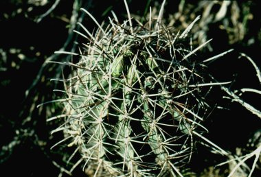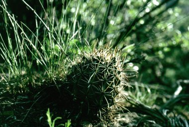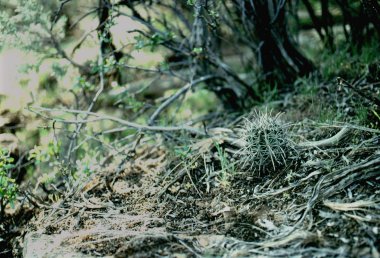 ごらんのように木立のなかで木漏れ日を浴びながら育つコロニーです。ニューメキシコとの州境から少しコロラドに北上したあたり、標高が1700メートル近くあります。川に沿って帯状につづく疎林のなかで青々と育っています。比較的湿潤な環境ですが冬季は積雪もあるでしょう。樹下でほとんど日陰のような場所に生える個体は長細く育っていて蝦サボテンのようです。刺数は多くないですが、黒い刺と艶々と輝く肌のコントラスト美しい植物です。