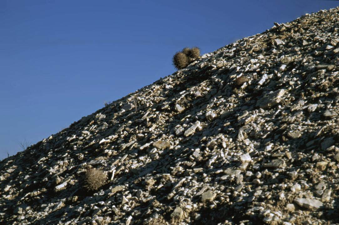 とはいっても、レッドサンドと石膏泥の地層的な境界付近に自生する点は同じ。思い切り干上がったセメント採掘場みたいな場所で、訪ねたのは6月でしたが開花の形跡も成長の様子もありませんでした。硬く縮んでいるせいで、刺がいっそう密生しているように見えます。大株はストレスをうけ、肌が褐変したり刺が退色しているものも多いのですが、それはそれで野性味です。少なくともこの年の春は降雨を見ず、休眠したままだったと思われます。ペディオ・スクレロ産地では往々にしてあることのようで、雨がふらないので3年間休眠、といったことさえあるようです。