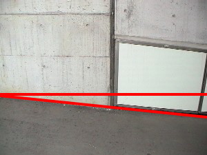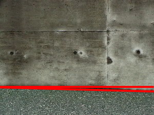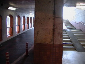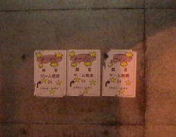 | スロープの壁面に早くもゲーム喫茶のビラが貼られていました。 いずれ、こういった心無いビラや、落書きなどで汚くなっていくのでしょう。また、こういった雰囲気につられて不良少年たちが屯したりしないか心配です。 |
