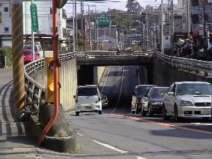 | 新松戸の立体交差は線路が半高架になっていることから、勾配が緩やかです。また、道幅も広く、線路床幅が狭いため、地下部分も十分に自然光が入りますし、排気ガスが充満することはありません。この程度のスロープであれば不便を感じる人はほとんどいないでしょう。 | 松戸駅の南400mほどのところにある立体交差は建設時期が古いため自転車用スロープがありません。車道の路肩を自転車が往来します。複々線を潜っているのですが、五香の立体交差よりも地下部分がはるかに少ないので排気ガスや暗さも五香ほどではありません。上の写真では見えませんが、線路沿いに歩行者用階段の出入口があります。しかし、駅から離れていることもあって利用者はかなり少ないです。 |