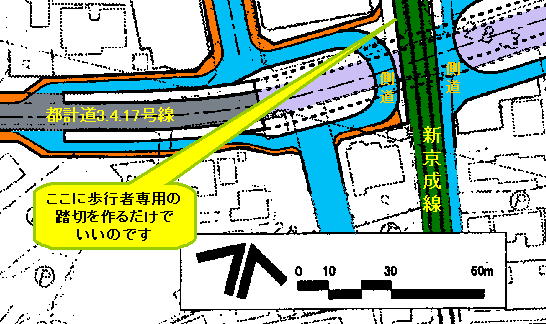 この問題を解決するためには、まずは踏切を復活させることが必要だと思います。それは立体交差を壊して元とおりにするということではなく、単に歩行者専用の踏切を設置することです。現在の線路位置、道路位置からも、また、コスト面からも十分可能な措置と考えます。