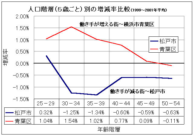 算出方法例(「25−29」の値) 1999年に25歳〜29歳の人口数=A 2001年の27歳〜31歳の人口数=Bとし、 (B/A)の平方根から1を除したものを増減率とした。データ源=松戸市ホームページ、横浜市ホームページ ⇒ 複製・配布はどうぞご自由に