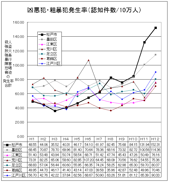 もう見過ごすことはできない 松戸の治安悪化状況 東京都東部との比較 データ収集にあたっては、広井@しんまつど氏の多大なるご協力がありました。 データ源=東京都統計(平成2年版〜13年版)、千葉県統計年鑑(平成2年版〜13年版) ⇒ 複製・配布はご自由にどうぞ