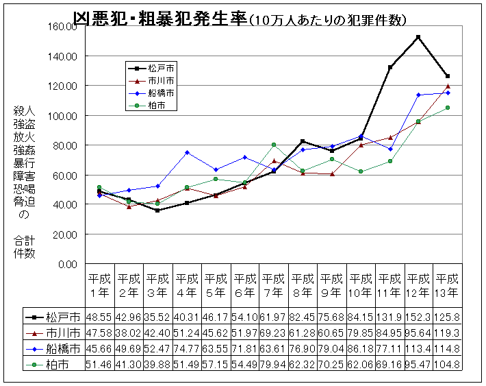 少しだけ改善しましたがまだまだ最悪水準 松戸の凶悪・粗暴犯罪発生状況〜平成13年 千葉県近隣都市との比較 暴行・傷害・恐喝は減りましたが平成12年と較べて放火は1.6倍、強盗は2倍の件数に増えています。