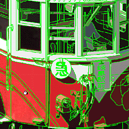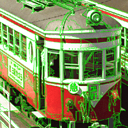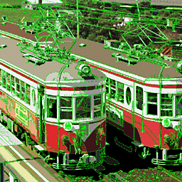 色の境界ラインが引き終わると(図22)、ラインで囲まれた中をベタ塗りします。”塗りつぶしツール”の選択する色の範囲を多くして、+optionの”スポイトツール”で近辺の色を指定しながら塗りつぶしてください(図23、図24)。 塗りつぶし忘れのチェックにはオリジナルPhotoshopプラグインソフトウェア「孤立Pixelを前景色で塗りつぶす」がたいへん便利です。 基本的にはこれでイラスト調の画像が出来ますが、墨線とベタ塗りのみでは質感表現をしにくい部分がでてきます。この画像の場合、線路の間の砂利や左上に見える田んぼなどがそれでにあたります。また、樹木は墨線を引かなくても楽に表現する手段がありますので、これら部分に関しては墨線引きとベタ塗りを行わずに次工程へ進みます(図25)。 |