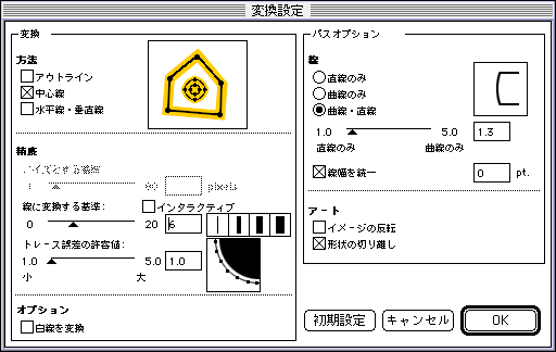 | 墨線をパスデータにしておくと、画像のサイズ変更等がたいへんしやすくなり、線幅を一定に保てるたせることができます。 墨線のパス化はAdobe Streamline4.0Jを使います。ます、Photoshopで前述「基本イラストの完成」で作成した画像を墨線において、選択範囲を反転チェックボックスを指定して墨線以外の選択範囲を呼びだします。これを編集メニューの”塗りつぶし...”により白で塗りつぶし、白地に墨線だけの画像を作り、別名で保存します。この画像をStreamlineに読み込ませます。Streamlineにおけるパス化の設定は、幅広くできますが、この場合は線画であるため、線の中心線をパス化する適切な変換設定を指定し(図53)墨線のトレース、すなわちパスへの変換を行います。変換後はAdobe Illustrator形式、またはEPS形式で保存しておきます。 パス化した墨線ファイルを再度Photoshopで開きます。開く場合の画像サイズは墨線なしイラストの画像サイズと同じにしておく必要があります。墨線なしイラストも開き、パス化した墨線ファイルを開いた画像をレイヤーの複製で重ねます。また、墨線なしイラストを前述JAGIIで画像サイズの拡大を行い、これにパス化させた墨線を重ねると、よい結果で解像度の拡大が可能になります。こうすることにより、画像のサイズに関係なく、墨線と墨線なし画像を自由にコントロール出来ることになります。 |