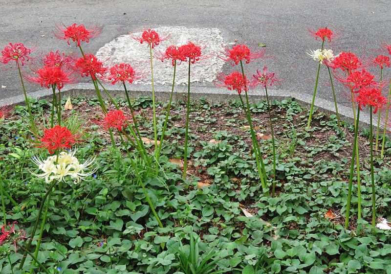 今日の画像は、勤務校の彼岸花です。勤務校の中庭や花壇でも彼岸花が咲いています。中庭の桜の古木の周囲に咲いている彼岸花は、赤い花に混ざって白い花が2輪咲いています。赤と白が混在してこともあるようです。