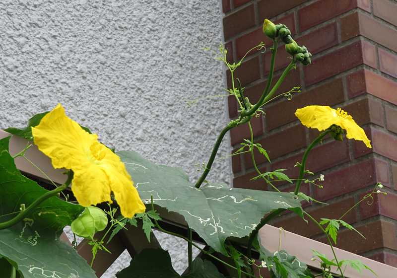 今日の画像は、キュウリの花です。ご近所のお宅の垣根に黄色い花が咲いています。先日の散歩中に、花を咲かせているツルの先にキュウリが育ち始めているに気が付きました。