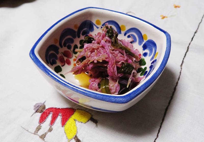 今日の画像は、「もってのほか」です。次女の夫の実家がある山形県は、食用の菊の花が名物です。天皇家の家紋である菊の花を食べるとは、「もってほか」ということだそうです。次女一家に実家から食用の菊の花が届き、酢漬けにした「もってのほか」を分けてもらいました。結構美味ししです