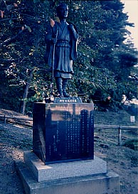 芭蕉像は境内入口に。私はカメラを忘れ、門前の土産物屋で買った「うつルンです」でこれを撮影。光線の関係でヘンな角度から撮っています。(95/10)