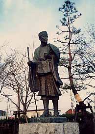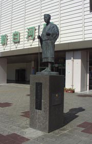 泊数の多さに敬意を表してか、町内には「奥の細道」関連の句碑やら記念スタンプやらがそちこちに。お供の曽良(そら)を従えた芭蕉像は「芭蕉の館」前に。ここでは、奥の細道の行程や芭蕉の文学についていろいろと学べますから、興味のある方は是非どうぞ!(95/11)