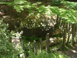 さて、受付で拝観料***円を払って、境内を進むと、高さ1m、幅2mほどの苔むした巨石に出くわします。これが文知摺石(見づらいかもしませんが、右写真の柵で囲まれた部分)。