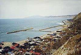 右写真で海岸線の行き着く先にうっすらと見えるのは弥彦山。ここではお見せできませんが、真向こうに佐渡ヶ島がデンと横たわる姿を望めます。