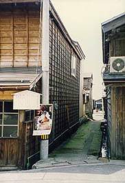 翁が出雲崎に宿したのは七夕も間近の七月四日(陽暦8月18日)のこと。左写真は、芭蕉が宿泊したと伝えられる「大崎屋」の跡。間口が狭く、奥行がいじょうに長い建物は、宿場としての歴史を感じさせます。