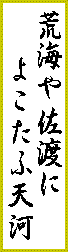 (眼前の日本海には)荒波が立ち騒ぐ。(その彼方には幾多の悲しい歴史を秘めた)佐渡島があり、(仰ぎ見る七夕の夜空には、今宵、二星が相合うという)天の川が横たわっている。