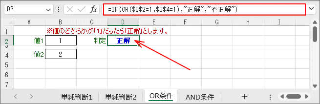=IF(OR($B$2=1,$B$2=2),"正解","不正解")