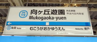 小田急の駅名板(向ヶ丘遊園駅) なお、遊園地は2002年に閉園したが、駅名になじみがあるため、改名されていない。 (2025年5月撮影) |