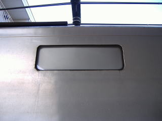 1段下降式窓 黄色のラインはアルミ板に塗装したものをボルトで固定していた(つまり立体的になっていた)が、後に腐食防止のためフィルムに取り換えられた。 (2004年5月29日 西武池袋線ひばりヶ丘駅) |