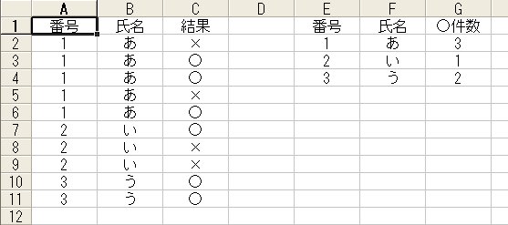出現値を重複なしで抽出し、該当する記号(○印)の件数をカウントする。
