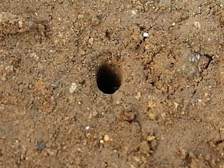 ハンミョウの幼虫がいる穴。穴のまわりがきれいなので,アリの穴(穴の回りに土が盛り上がっている)などと間違えることはないと思います。大きさは,ハンミョウの種類によって違いますが,トウキョウヒメハンミョウだと直径2mm以下,ハンミョウだと,もう少し大きめです。
