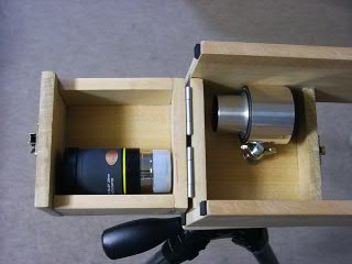 箱の部分を開けます。この蓋の部分がバランス用のおもりを入れるポケットにもなります。箱の中にはアイピース2本と天頂プリズムが収まります。観測中も,交換用アイピースや小物を入れる場所として,この箱は大活躍します。