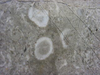 比較のため,現在のサンゴ(キクメイシの仲間)を 紹介しておきます。 生きているサンゴではなく,骨格です。 現在のサンゴは六射サンゴの仲間で, 四射サンゴは現在,生存していません。 放射状の骨格を持ったサンゴが集まって 群体になっているようすがわかります。 |