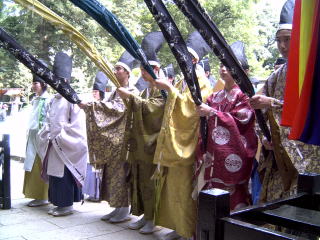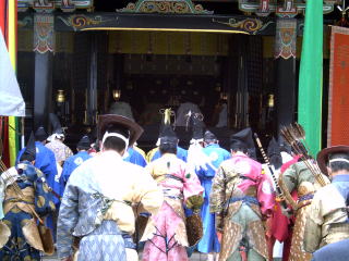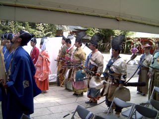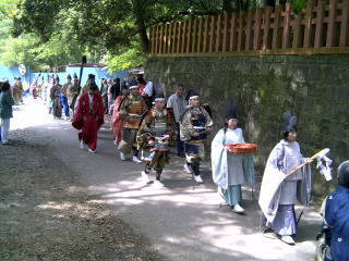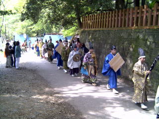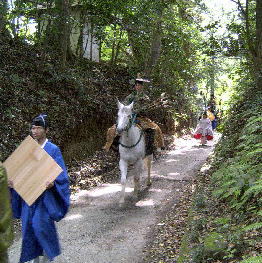 | 本殿へ参拝にゆく、演武者一同の列です。 | 童子、換弓持、的持、射手と順に並んで進みます。 |