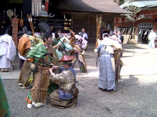 | 本殿ではご宗家ほか、安全を祈願して参拝。換弓持ちを始め、諸役も本日の安全祈願をお祈りしました。 | 参拝も終わり、いよいよ本番に向け、装束も最終準備に。射手の皆さんは鹿皮で作った「むかばき」を着装しています。西部劇ではカウボーイが牛革の同じようなのをつけていますね。馬に乗ってちょうどよい長さなので、歩くときは裾を持ち上げて歩いていました。 |
