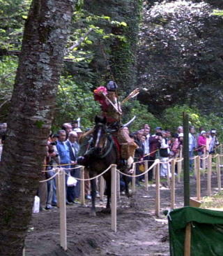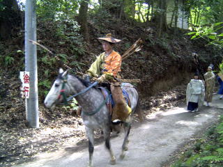 | 馬場へ向かう馬上の射手。鎌倉時代の装束です。 | 切り通しの山道を歩く姿は、鎌倉時代そのまま。 |