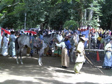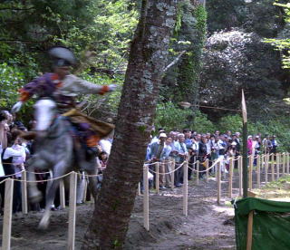 | 大勢の見物人の集まった桜馬場。開催の宣言を受けいよいよ射手は馬上へ。 | |