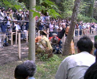 | 会場は桜馬場。江戸時代まで流鏑馬が行われていたところです。名前は残っていましたが、本当の流鏑馬が行われるのは、何年ぶりでしょうか。 | ちょっと見にくいかもしれませんが、日記役から射手代表に「流鏑馬・笠懸はじめませい。」と開催を宣言されたところです。射手は「おー」と答えます。 |