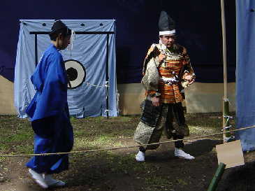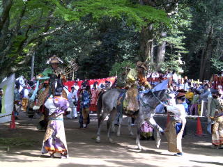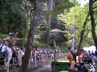 | 前日の雨も大したこともなく上がり、好天のもと香取神宮(千葉・佐原市)で流鏑馬・笠懸が 弓馬術礼法小笠原流一門により奉納されました。装束は鎌倉時代の狩装束です。 残念ながら馬場の距離が足りず、安全上問題があるので、的一つの流鏑馬になりました。 (笠懸は的一つ、流鏑馬は的三つで行われます。) |