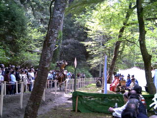 奥に見えるのが笠懸の的。足下に斜めに差してあるのが小笠懸の的(八寸)になります。 鎧を着ているのが、的奉行です。飾りで着ているのかと思ったら、それた矢が飛んでくる可能性があるので、欠かせないのかもしれませんね。控えの方々は馬が来ると、奉行の後ろに隠れていました。 馬場元役・馬場末役という前後から馬が飛び込んでくるところの役も鎧着用でした。馬に踏みつぶされたら、鎧が少しは役に立つかも。 |