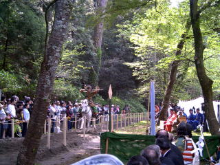 | 笠懸(上)。的までのが流鏑馬より遠いので、難しい技術が要求されます。 | 流鏑馬 雁又の矢が、的についた一瞬。 |