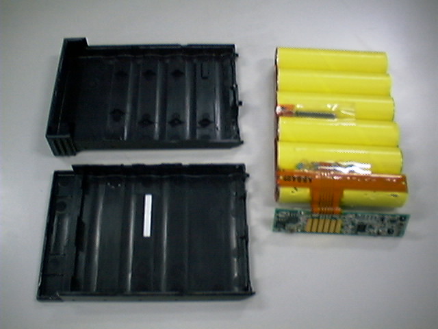 | バッテリーケース下側(手前)と上側(奥側)、バッテリーセル |