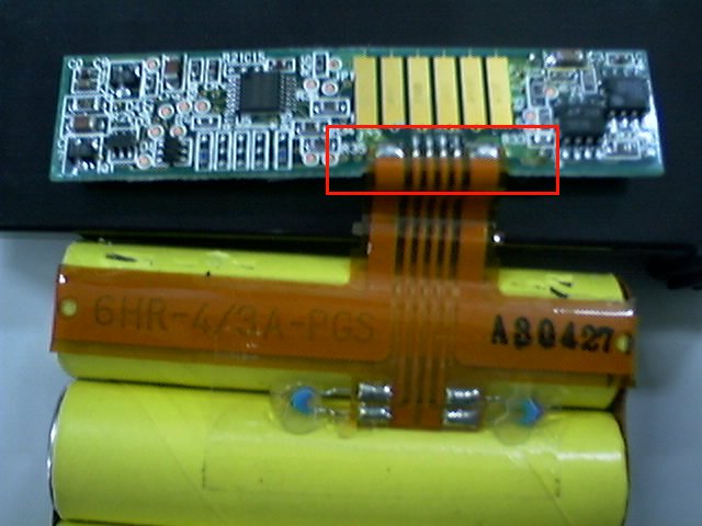 電池ケースとの配線を行う場合、このフレキシブル基板は諦めて、制御基板の端子(写真で囲った部分)から配線をしたほうが容易でしょう。 |